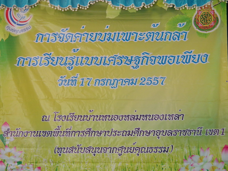 โรงเรียนบ้านหนองหล่มหนองเหล่าจัดกิจกรรม บ่มเพาะต้นกล้าการเรียนรู้ระบบเศรษฐกิจพอเพียง เพื่อปลูกฝังและสร้างวินัยขยัน ประหยัด ซื่อสัตย์ อดทน พึ่งพาตนเอง กิจกรรมจัดขึ้นเมื่อวันที่ 17 กรกฎาคม 2557 ณ โรงเรียนบ้านหนองหล่มหนองเหล่า อำเภอม่วงสามสิบ จังหวัดอุบลราชธานี |